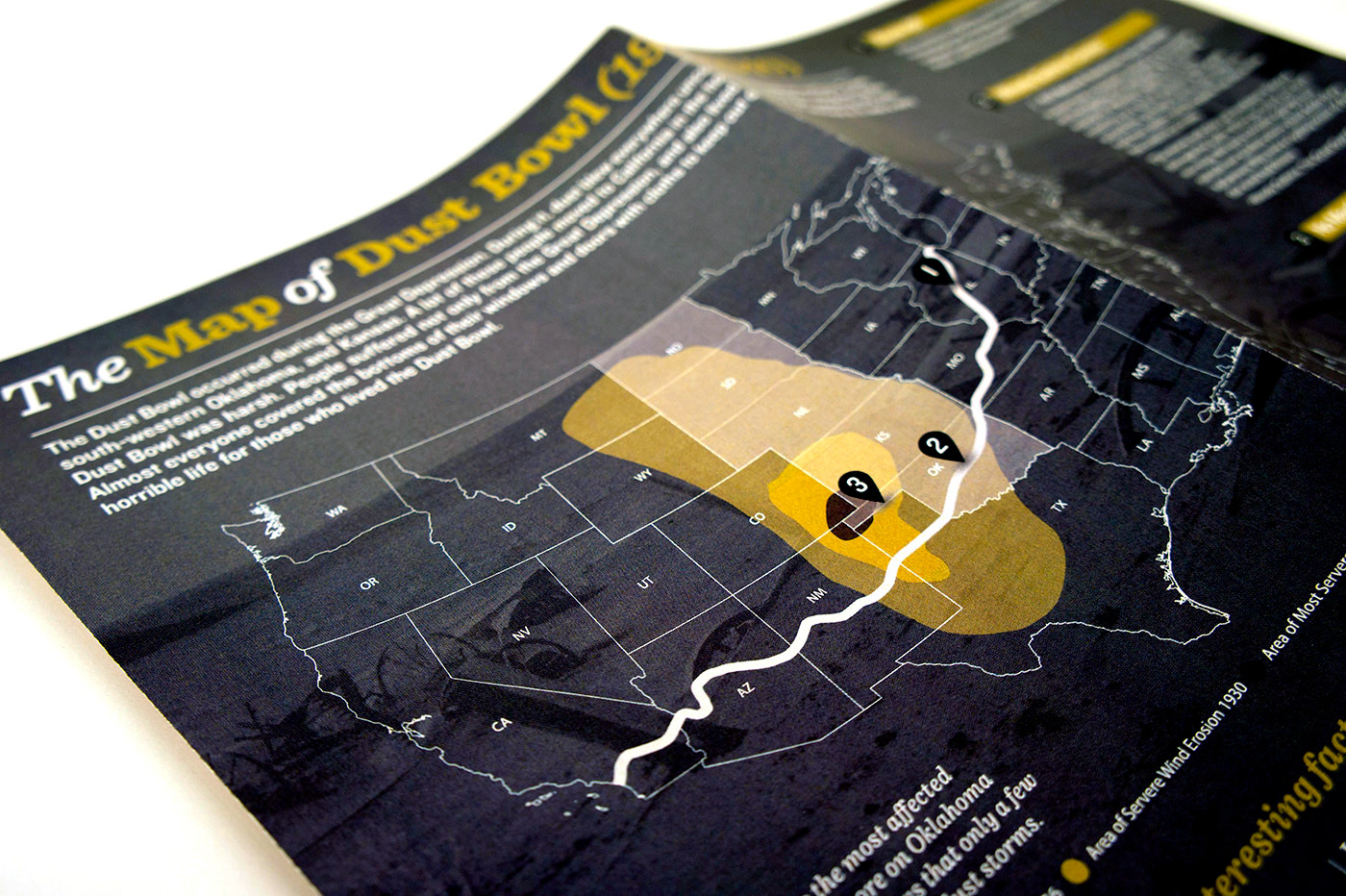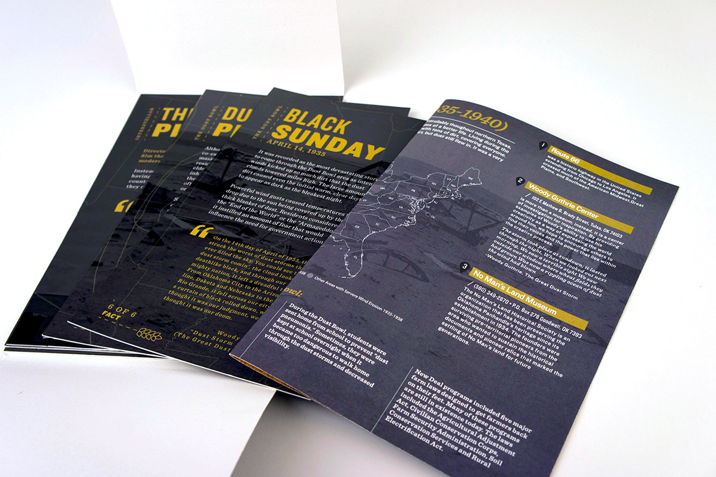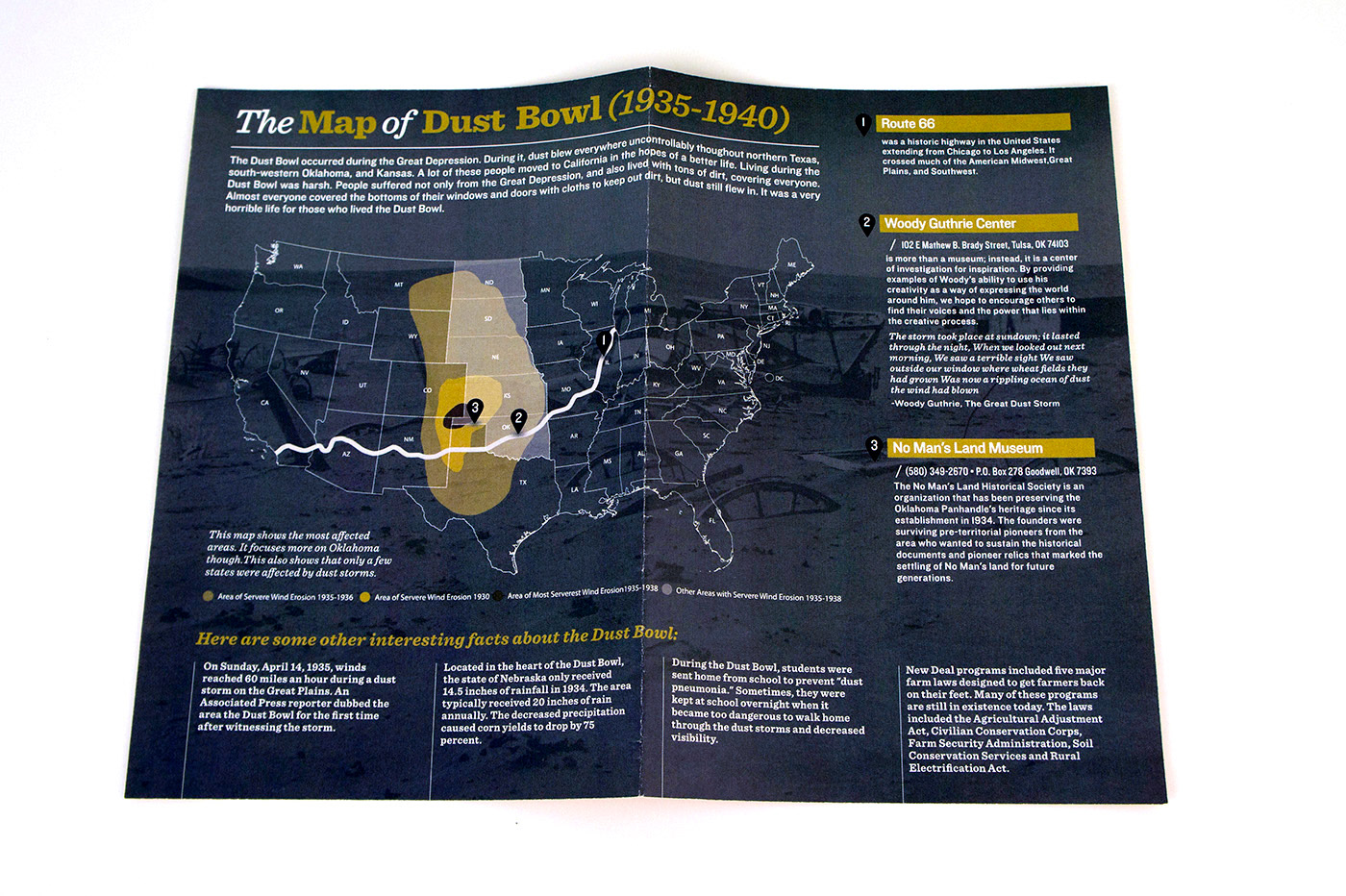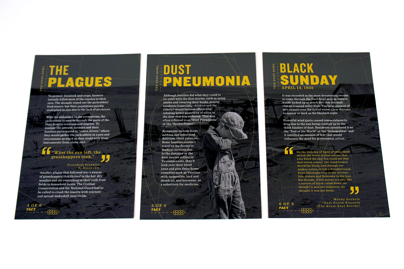 My partner and I decided to cover the "Dust Bowl". Since we pictured the information set to be distributed to students at Dust Bowl related museums (i.e Woody Guthrie Center, No-Man's Land Museum), we chose the essential features of the design to be a card set and a map in order for the set to be engaging and hands-on for students.