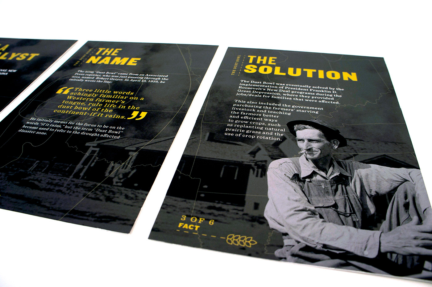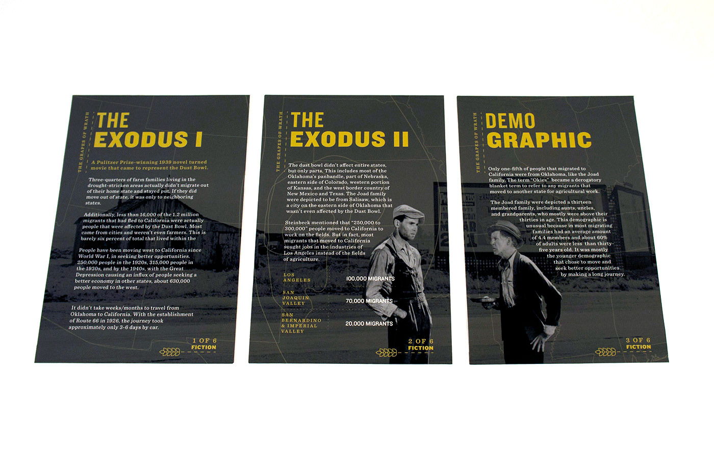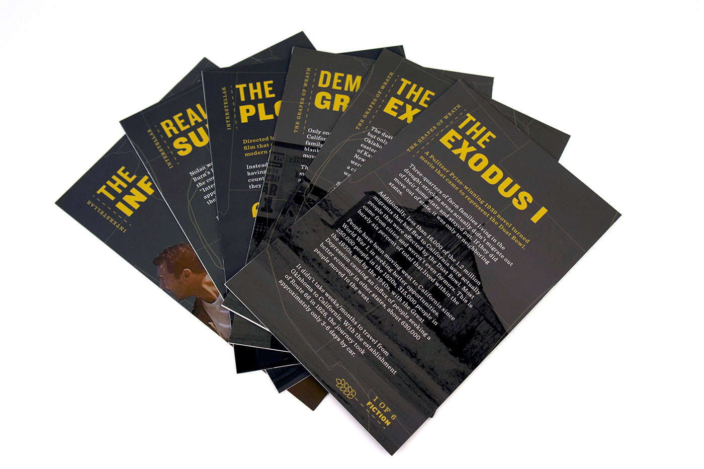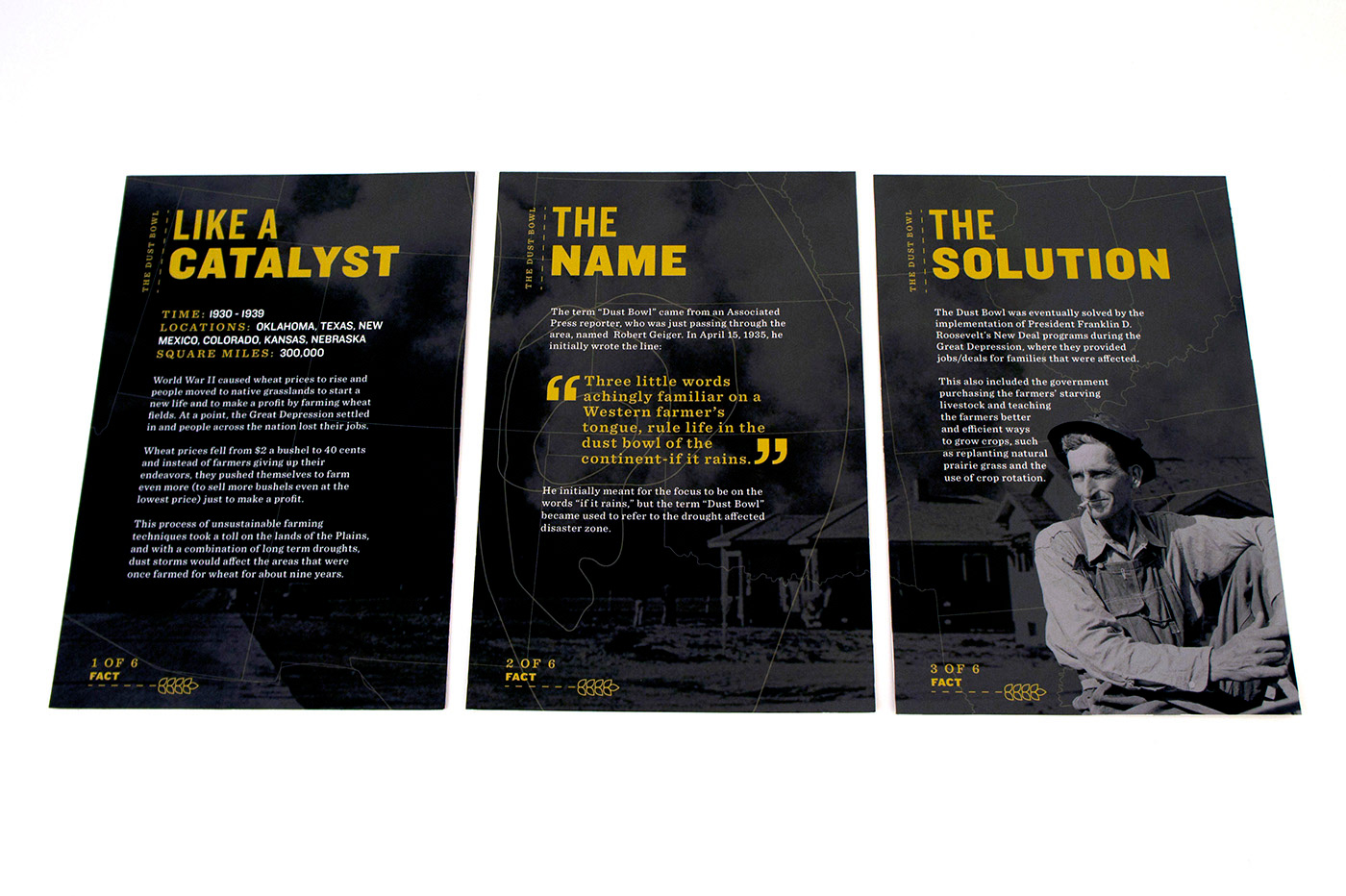 My partner and I decided to cover the "Dust Bowl". Since we pictured the information set to be distributed to students at Dust Bowl related museums (i.e Woody Guthrie Center, No-Man's Land Museum), we chose the essential features of the design to be a card set and a map in order for the set to be engaging and hands-on for students.